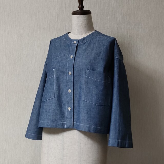 ブルーシャンブレーは、光の当たり具合等で画面上と色が異なって見える場合があります。使用している生地は、ブルーグレー系の色味です。