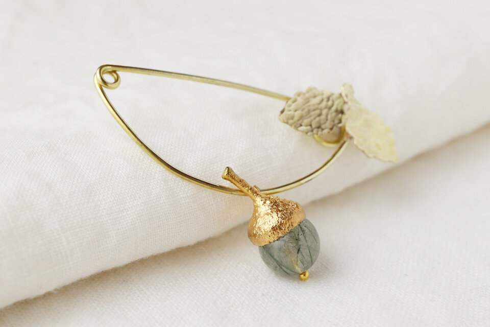 素敵なドングリのハットピンでした!ずっと気になっていた作品を思い切って購入して本当によかったです。真鍮が高級感があってタイガーアイの色味にうっとりします。同封された作品の取り扱い説明書に、中に本物の植物が入っています。と書いてあって、いつでも枯れない本物の植物を身に付けておでかけできるなんて、素敵でワクワクします。とても気に入ったので大切に使わせていただきます。ありがとうございました!