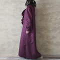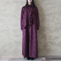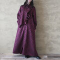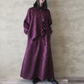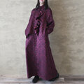 胸元に大ぶりのフリルをつけたマキシ丈のワンピース