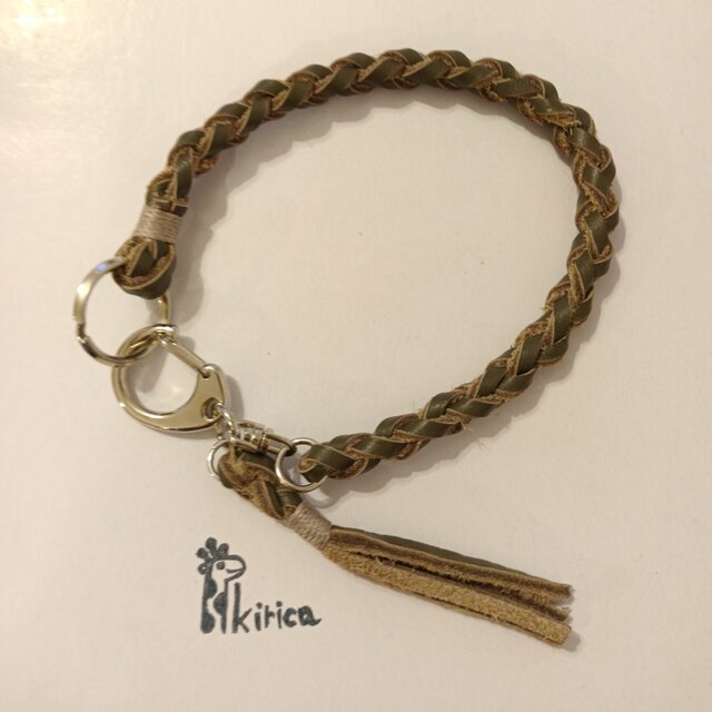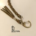 グレーの柔らかい革紐を編んで、27センチのキーホルダーストラップに仕上げました。同じ素材のタッセルも付いています。