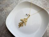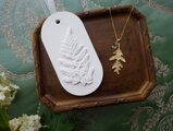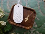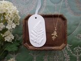 植物好き、ボタニカル好きのためにご用意いたコフレセットです。内容はシダ植物のオーナメントと木の葉のデザインのペンダントネックレス、計2点。それぞれを箱に入れてお届けします。