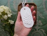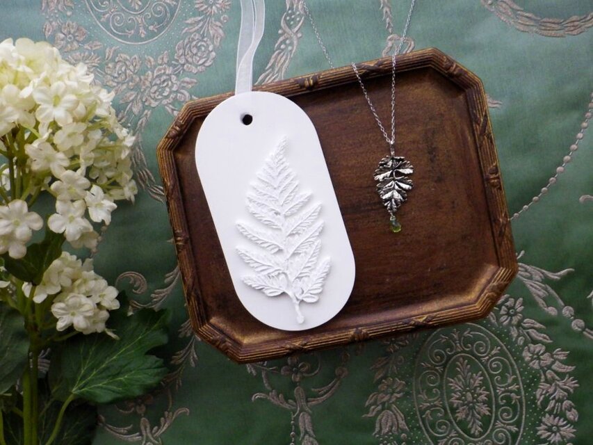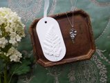 オーナメントは、細かいところまで丁寧に仕上げたシダ植物のデザインのアロマストーン製のオーナメント。土台の色をホワイト、ブルーグレー色、どちらかを選べます。無垢な真っ白いオーナメントで神聖な世界観になります。また、落ち着きのあるブルーグレー色の背景に真っ白いモチーフを合わせると、洋食器にみかけるカメオ調のデザインになり、より格式高い仕上がりとなります。