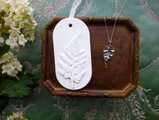 植物好き、ボタニカル好きのためにご用意いたコフレセットです。内容はシダ植物のオーナメントと木の葉のデザインのペンダントネックレス、計2点。それぞれを箱に入れてお届けします。