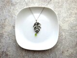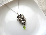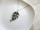 ペンダントネックレスは、トップ部分は古代銀色の植物モチーフで、さらに天然石、8月の誕生石であるペリドットのしずくをぶら下げました。朝露が木の葉から落ちる瞬間を再現したペンダントネックレスです。