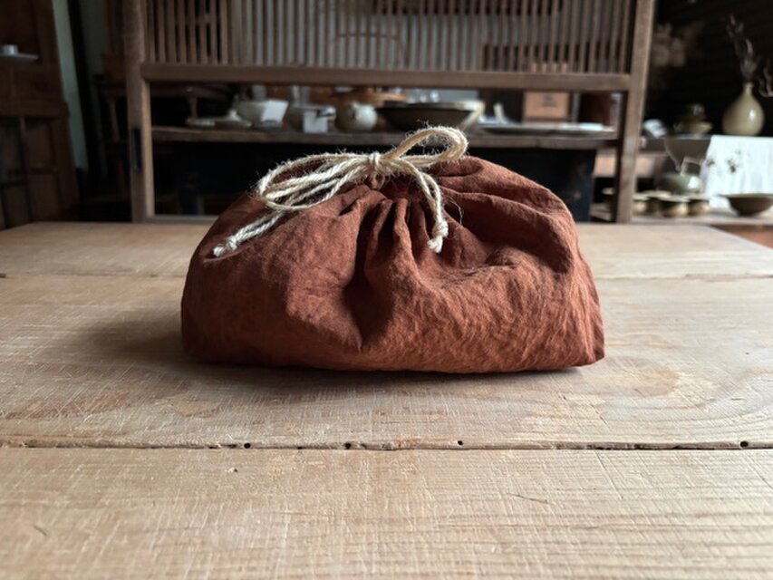 入れ口を絞る紐は、柿渋染め無媒染の麻紐。