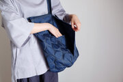 ジッパーそのものを肩掛けの持ち手として使用した、スクエアー型の底マチ付き布バッグに、デザイン性と機能性のある外ポケットが付きました。
