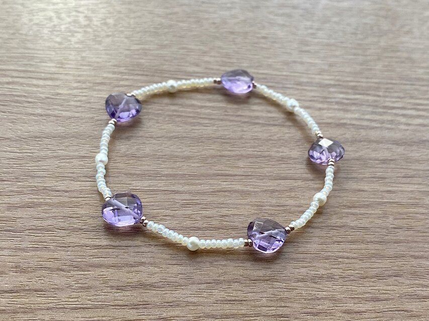 淡い紫色のハート型アメジストを主役にした、繊細なブレスレットです。