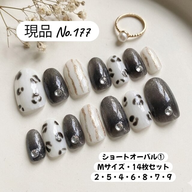 【現品 No.177】レオパード×ニュアンスネイル/ショートオーバル①・Mサイズ・14枚セット/大人モード ジェルネイルチップ
