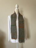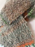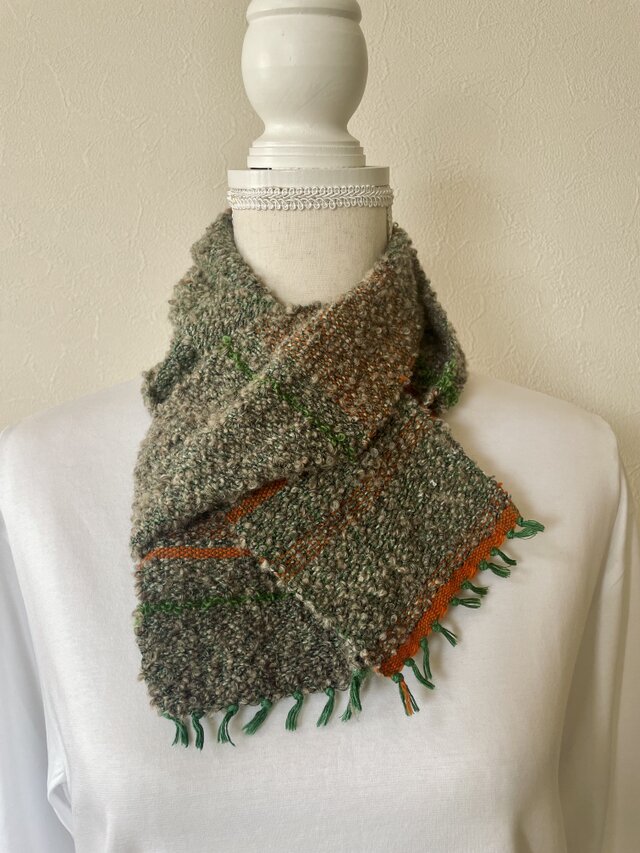 ポコポコのグレーのウール地に、かぼちゃカラーのしましまのミニマフラーです。
