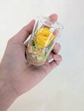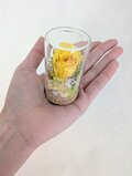 手のひらサイズのガラスボトルの中に黄色のミニ薔薇と小花、グリーンをアレンジしました。小さなギフトですが細かく少しずつ花材を使用し制作しています。