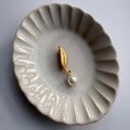 ヴィンテージゴールドのような渋みのある色合いとリーフのラフな質感。使用したあこやバロックパールは大きすぎない上品なサイズ感なので、普段使いにワンポイントとしてお使い頂けます。