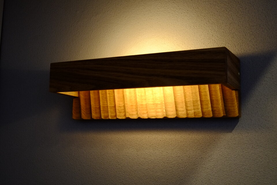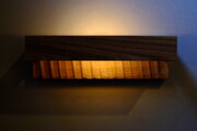 タモ無垢材を波模様に彫り込んだデザインの壁付けブラケットライトです