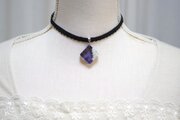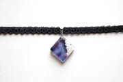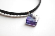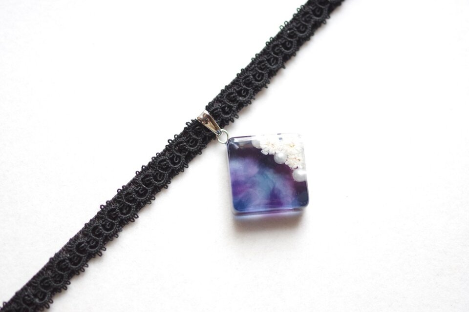 パールとお花を封じ込め、ブルーとパープルで着色したスクエア型のレジンを、ベルベットリボンにタティングレースで装飾を施したチョーカーに仕上げました。