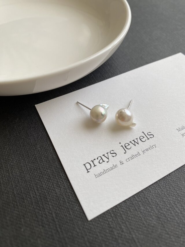 アコヤらしい肌理細やかな質感に、真珠本来のお色味、柔らかなニュアンスブルーの班が入り(片耳だけが顕著です。)凹凸がアクセントの美しい7~8mmアップのアコヤバロック。