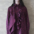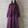 胸元に大ぶりのフリルをつけたマキシ丈のワンピース