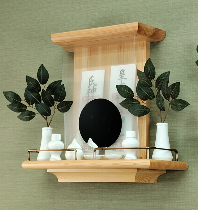 付属品:神具一式(榊は別途)、神鏡(3mmガラス)、こぼれ止め金具一式、取付用金具(ボード釘付属、ビス付属)