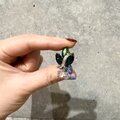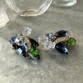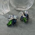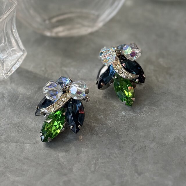 エメラルドグリーンとサファイアブルーのマーキスカットストーンに、オーロラ加工(AB加工)が施され、大粒のビーズやラインストーンを組み合わせたデザイン。