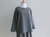 ドロップショルダーと長袖の筒袖のゆったりとしたシルエットです。ボタンなども省いたラウンドネックなので、脱ぎ着も簡単、お手入れも楽々です。