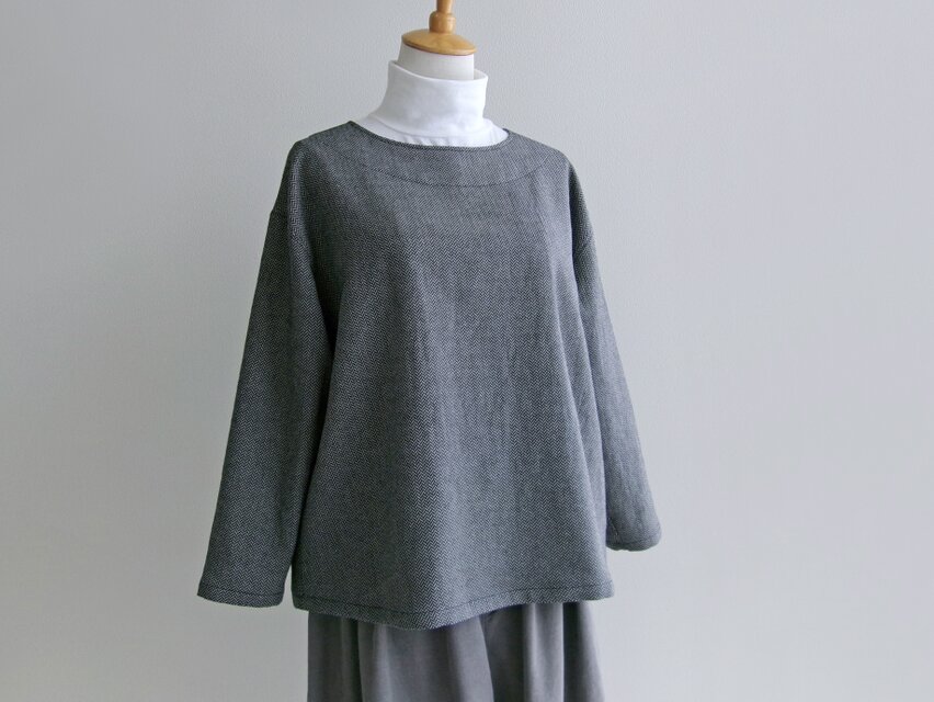 コットン100%なのにツイード生地のように見える、黒×アイボリーのヘリンボーン織の国産コットン生地を使った、シンプルなプルオーバーです。