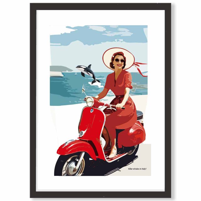 ヴェスパと走るシャチ? イタリアにシャチはいないでしょうポップポスター。