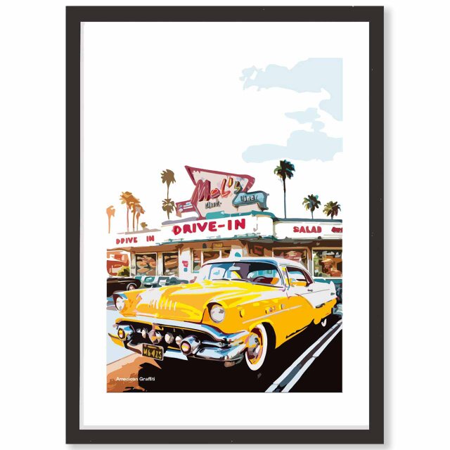 アメリカングラフィティイエローカー よき時代をイラストにしたポップアートポスター。