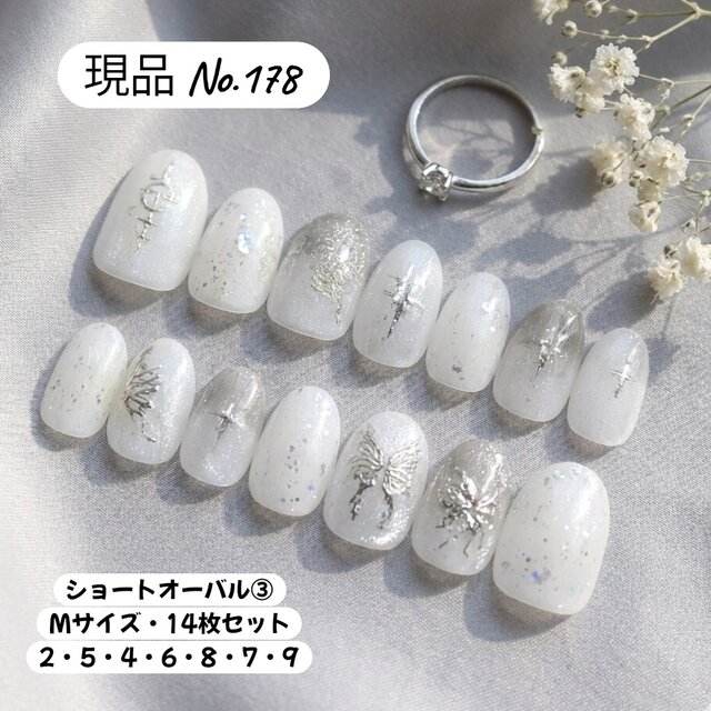 【現品 No.178】ホワイトラメ×シルバークロス&バタフライ/ショートオーバル③・Mサイズ・14枚セット/透明感