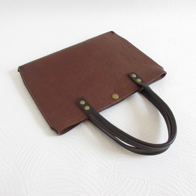 〇さらに深く濃いダークブラウンのハンドルを合わせコントラストも楽しめるフラットミニトートに仕上げています(^^