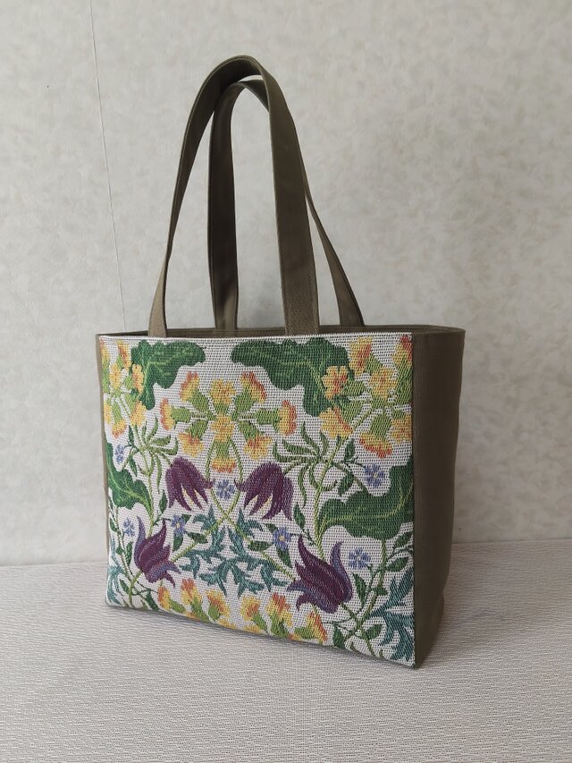 癒されるような色合いの植物が素敵なランチョンマットを使用して大き目なトートを作製しました。