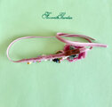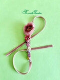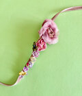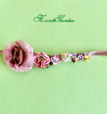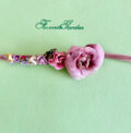 サーモンピンクのベルベットのリボンに大きめのピンクのローズとピンク ホワイト パープル 薄いイエローの花々を配した個性的なヘアコサージュです。