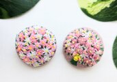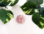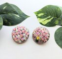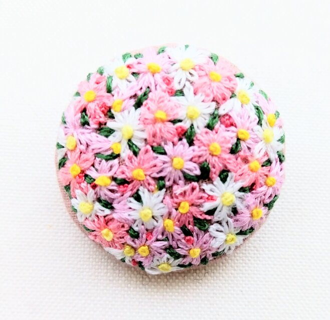 サックスピンク色綿リネン生地に優しい色合いのピンクの小花をモチーフの刺繍ブローチです。