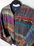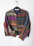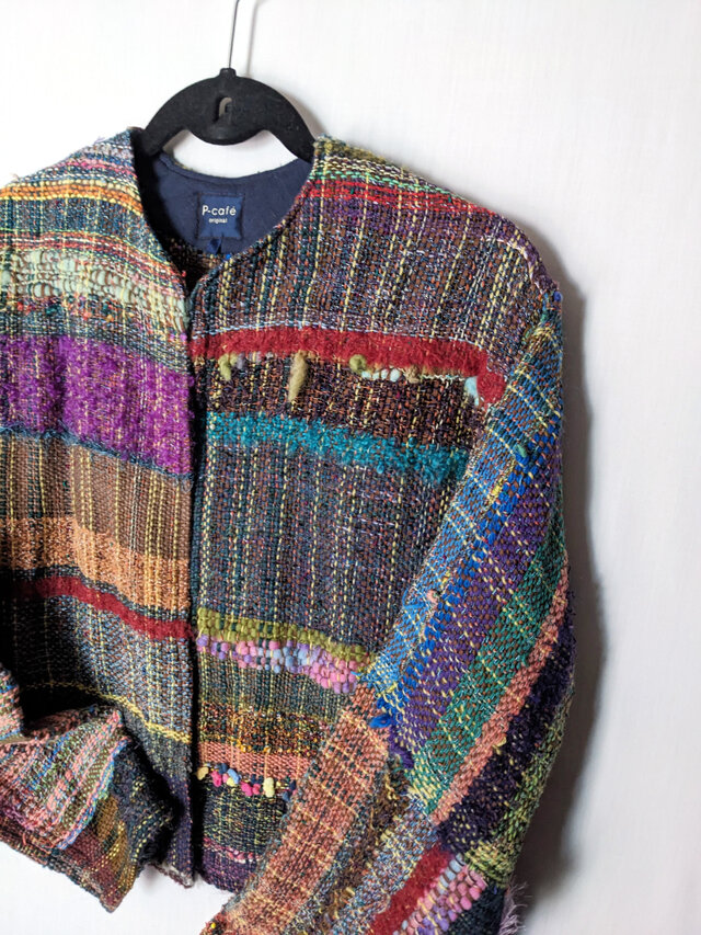 手織り生地を使って仕立てたノーカラーのジャケットです。
