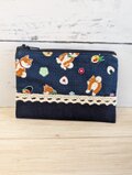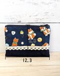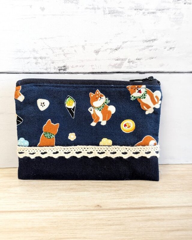 ネイビー地に柴犬とおにぎり柄が並んだ、和テイストがかわいいハンドメイドの小さなファスナーポーチです。