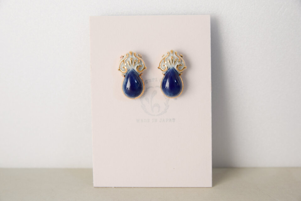 金彩の装飾がアンティークな印象を与える作品で、しずく型のぷるんとした形が可愛いらしいピアスです。