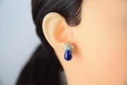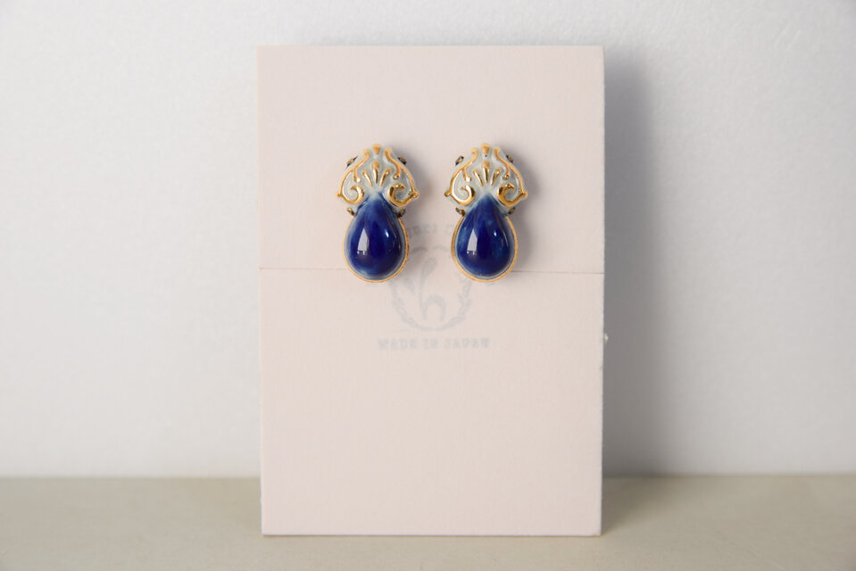 金彩の装飾がアンティークな印象を与える作品で、しずく型のぷるんとした形が可愛いらしいイヤリングです。