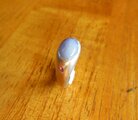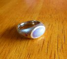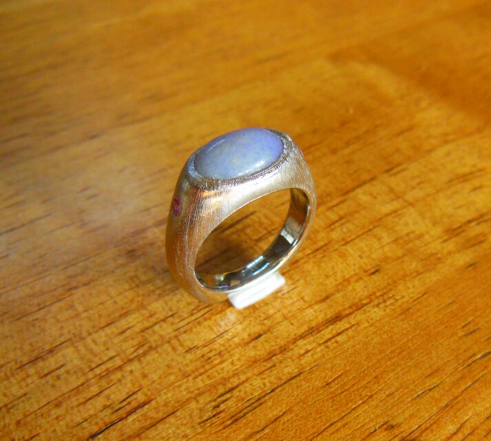 カボションカットのラベンダーヒスイのリングです。サイドにはレッドスピネルのメレ石がセットしてあり、シルクラインのテクスチャーをつけてあります。