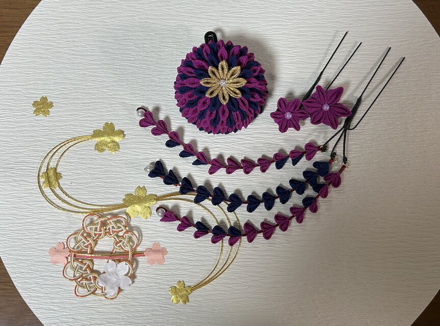 The dangling tassels are made with maru-tsumami folds, designed to sway gently with movement.