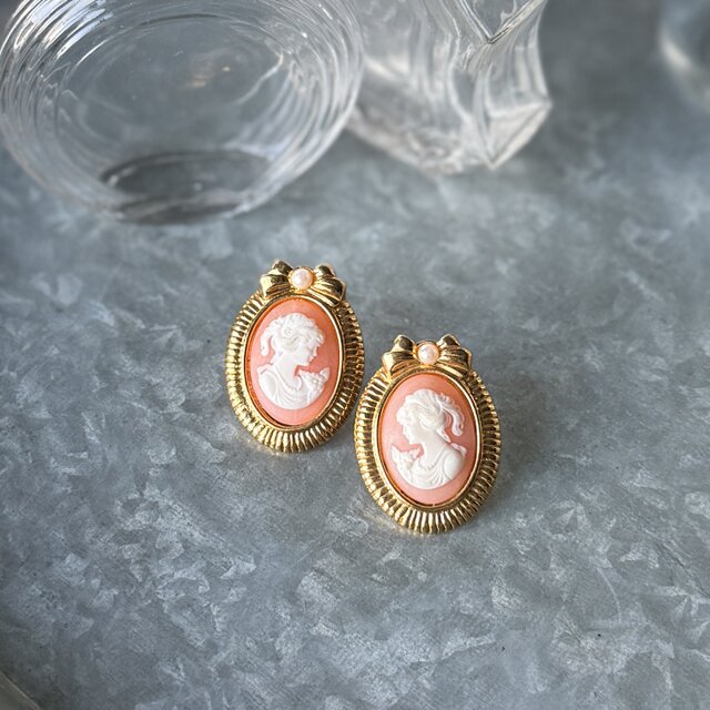 コーラルピンクの樹脂をベースに、貴婦人の横顔が浮き彫りになったカメオ。