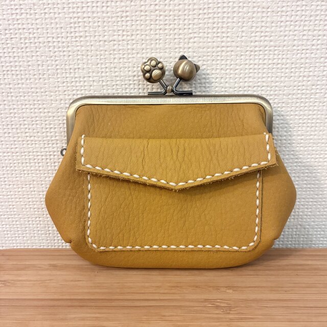 ぱかっと開くとお部屋が3つの親子がまぐち♪外ポッケが付いたネコ&肉球口金の本革ミニ財布