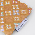 淡い色づかいの花が、きらびやかな地色に可愛さをプラスします。手裏剣のような花はヤマボウシ(山法師)です。