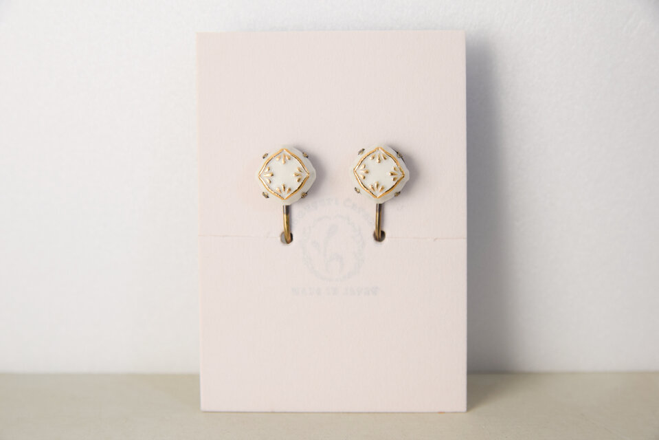 アンティークを想わせる形に成型した白磁に金彩で小さな花模様を描きました。さり気なく可愛らしい輝きが魅力のイヤリングです。