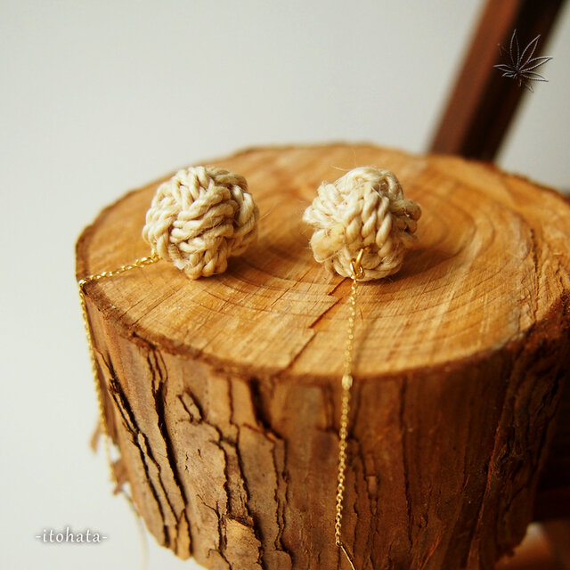 国産の精麻(麻の茎の皮)で結んだあわじ玉をピアスにしました。