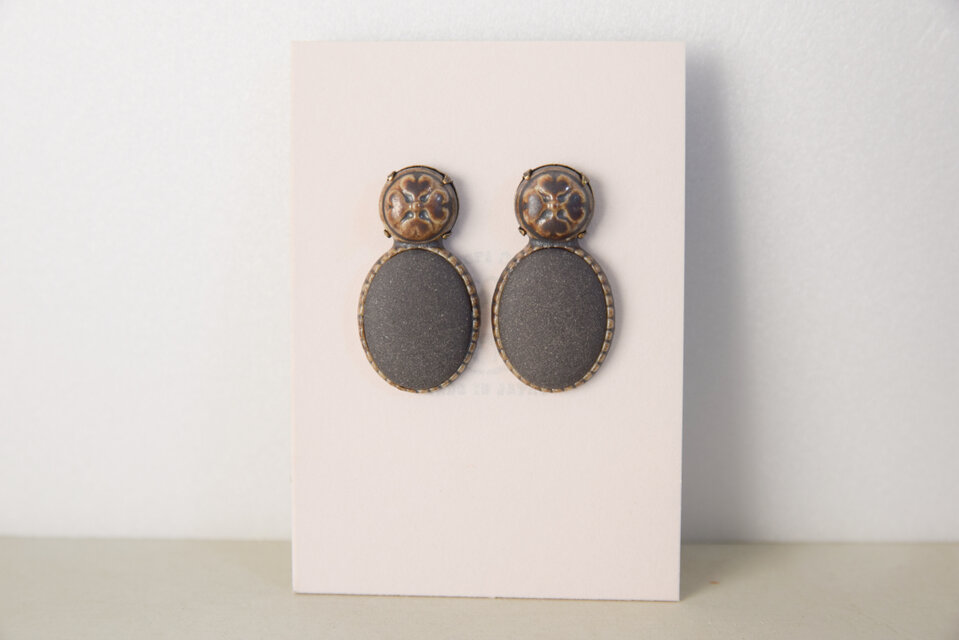 焼物の温かみを宝石のように閉じ込めたデザインの作品です。アンティークな印象の石枠もすべて焼物で1つ1つ表情に個性があります。