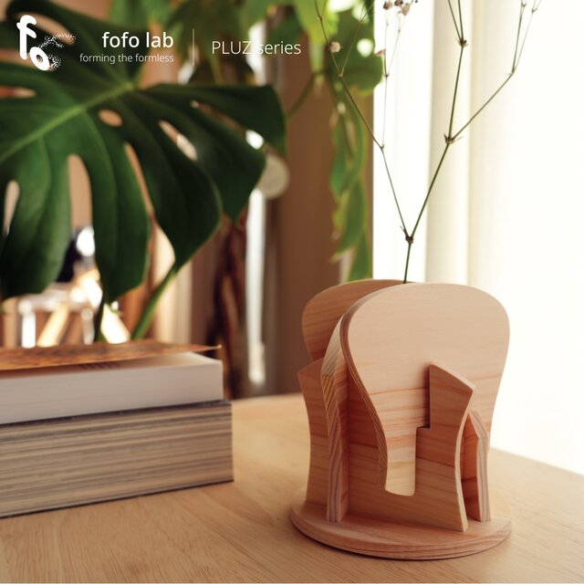 本作品は fofo lab 独自の PLUZ(プラズ)手法 により、5枚の厚さ6mmの桧板を異なる形状に加工し、組み合わせることで完成しました。この木の温もりの花瓶が、暮らしに少しの暖かさを添えてくれたら嬉しいです。