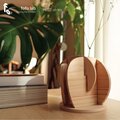 組み上がった花瓶はまるで小さな彫刻作品のよう。木片が空間の中で交差し、見る角度によって異なる立体的な表情を生み出します。手に回すことで、花と花器が織りなす形の変化を360度から楽しむことができます。
