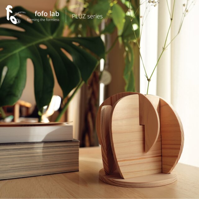 本作品は fofo lab 独自の PLUZ(プラズ)手法 により、5枚の厚さ6mmの桧板を異なる形状に加工し、組み合わせることで完成しました。この木の温もりの花瓶が、暮らしに少しの暖かさを添えてくれたら嬉しいです。