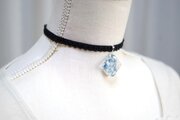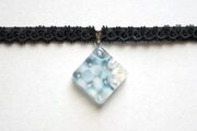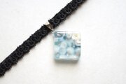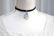 ホワイトとコバルトブルーが描く波紋がまるで水面のような、その透明感の美しさに魅入ってしまうレジンを、ベルベットリボンにタティングレースで装飾を施したチョーカーに仕上げました。