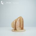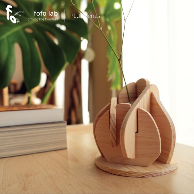 本作品は fofo lab 独自の PLUZ(プラズ)手法 により、5枚の厚さ6mmの桧板を異なる形状に加工し、組み合わせることで完成しました。この木の温もりの花瓶が、暮らしに少しの暖かさを添えてくれたら嬉しいです。