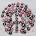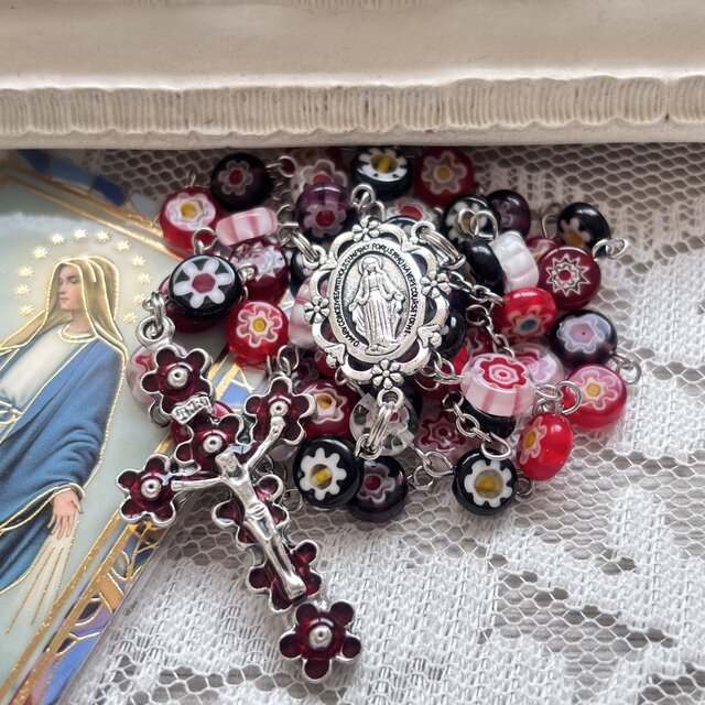 なるべくきれいなビーズを選んでつなげていますが多少の歪さ、花もきれいな形ばかりではありません。画像からもすべてが同じ形ではないことがおわかりいただけるかと思いますが完璧なビーズのロザリオをお求めの方には向いていないと思います。
