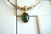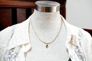 美しいグリーンの石にゴールドの枠、使用しているビーズや留め金もゴールドで合わせ、大人の女性のためのネックレスに仕上がっています。大きな石のネックレスは苦手、とおっしゃる方にもおすすめできるきゃしゃでありながら、華やかさもある美しいネックレスかと思います。
