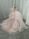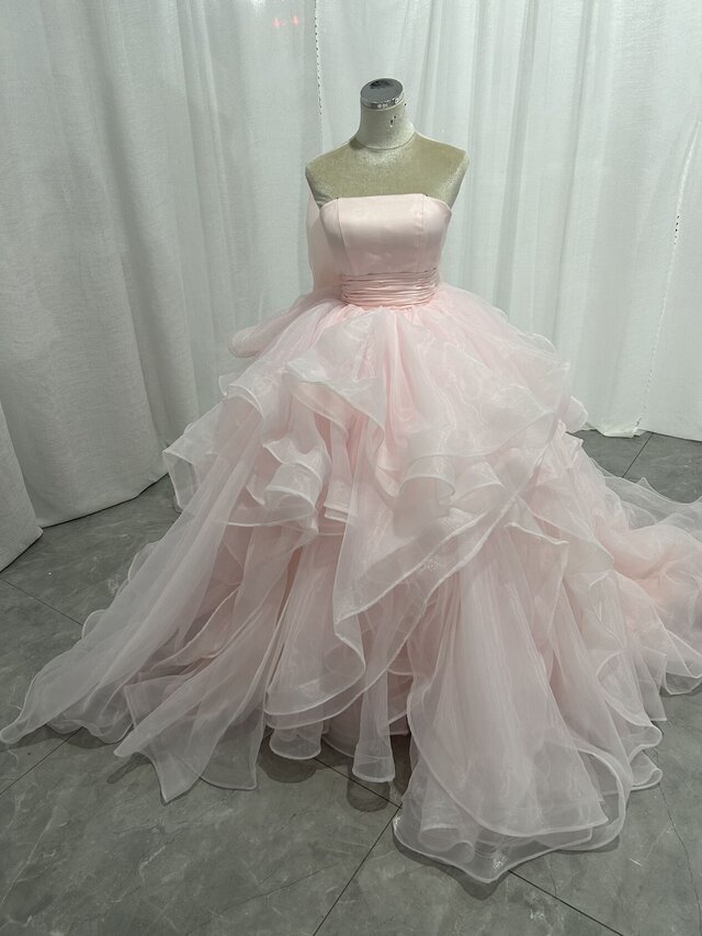豪華!カラードレス 薄桃色 ベアトップ ラッフルフリル 豪華なバックリボン プリンセスライン 花嫁